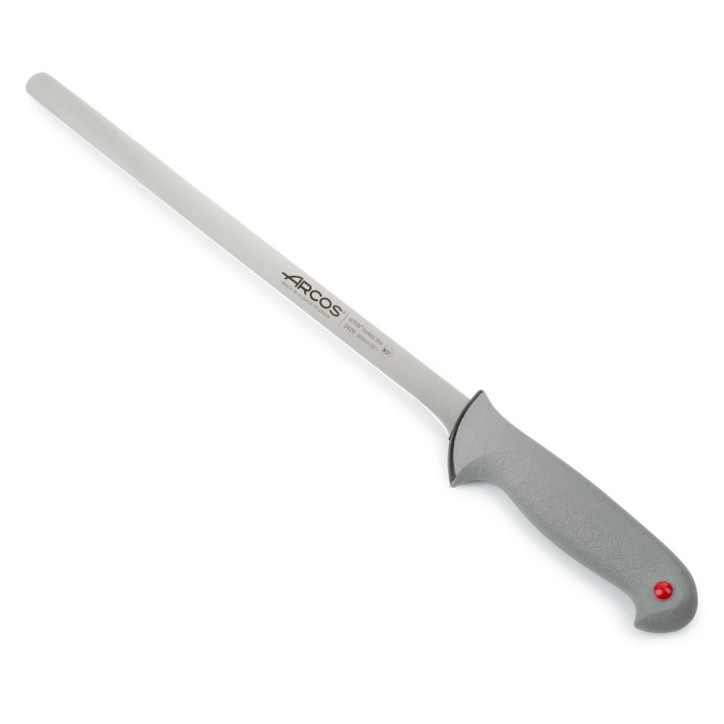 Este cuchillo permite cortar piezas de jamón de manera cómoda y ligera gracias a su hoja flexible. Ha sido elaborado por Arcos, empresa experta en el sector de la cuchillería desde el año 1734. Es útil tanto para la cocina profesional como doméstica.